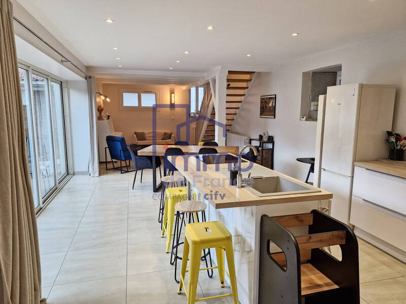 L'espace principal comprend la cuisine et la salle à manger, tandis que le séjour, saura vous séduire avec son mur en pierre apparent, ses poutres en bois et son atmosphère chaleureuse..