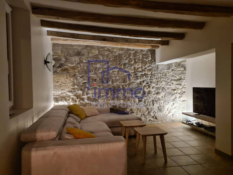 L'espace principal comprend la cuisine et la salle à manger, tandis que le séjour, saura vous séduire avec son mur en pierre apparent, ses poutres en bois et son atmosphère chaleureuse..